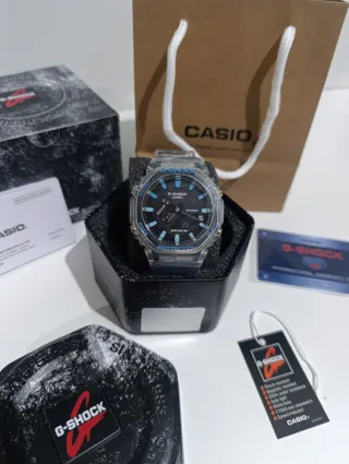 Reloj Casio G-Shock con un diseño llamativo y moderno. - Correa de caucho negra. - Caja transparente. - Esfera oscura con detalles blancos.
