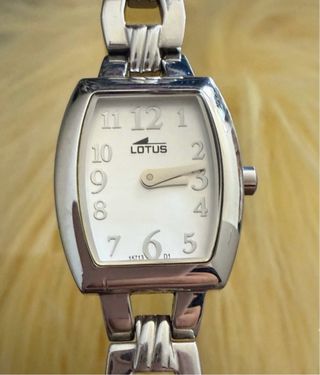 Elegante reloj de pulsera de la marca Lotus. - Diseño moderno con detalles plateados. - Esfera blanca con números claros.