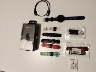 Reloj deportivo Garmin Forerunner 235 con varios accesorios. - Correa de reloj blanca. - Correa de reloj negra. - Correa de reloj roja. - Correa de reloj verde. - Cargador USB. - Juego de herramientas para cambio de correas. -Otra batería del reloj. - Caja original.