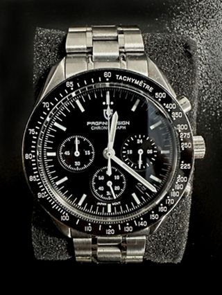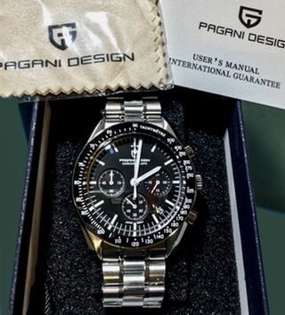 Pagani Design PD-1701 V3-New (Homenaje Omega Ω Speedmaster), como nuevo y listo para usar. Es un reloj deportivo muy elegante y funcional. - Diseño inspirado en el Omega Ω Speedmaster. - Esfera negra con agujas fluorescentes Lumibrite. - Brazalete macizo de acero inoxidable (con eslabones completos). - Movimiento japones Seiko Meca-Quartz VK-63. - Corona roscada. - 100M Water-Resistant. - Cristal Zafiro con tratamiento antirreflectante. - Caja de acero inoxidable 316L. - Versión V3-New (con aguas más gruesas y esfera negra más oscura). - Se entrega en su estuche original con su certificado de fabricación.