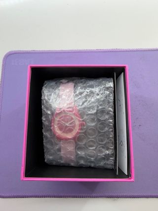 Reloj Swatch original con doble vuelta de muñeca. - Diseño en color rosa. - Pulsera de silicona con purpurina.