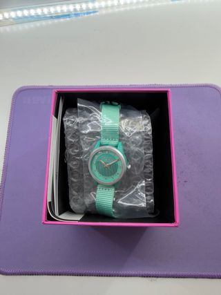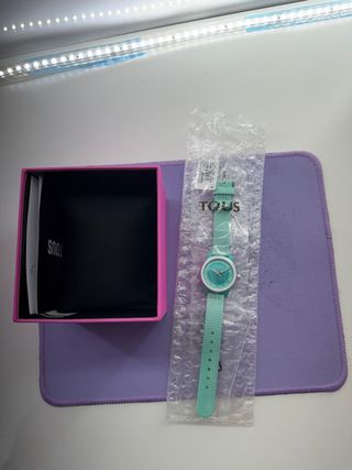 Reloj de la marca Tous en un llamativo color verde y turquesa. Viene con su caja original. - Diseño moderno y juvenil. - Correa de tela. - Esfera con detalles en relieve.