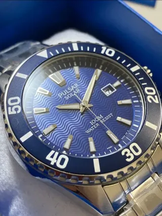 Reloj Pulsar Solar, segunda marca de Seiko, que presenta una esfera azul, correa de acero inoxidable y resistencia al agua hasta 100 metros. Es un reloj solar. Para cargarlo, simplemente expóngalo a la luz. El reloj funciona correctamente. Regalo correa de buceo azul. Se incluye estuche original. Se encuentra en perfecto estado. Consulte las fotos detalladas para conocer el estado exacto. Las fotos también forman parte integral de la descripción general: se vende tal como se ve. Palabras de búsqueda: Seiko, Citizen, Orient, Rolex, Casio, Swatch, Moonswatch, Omega, Bulova, Invicta, Addiesdive, Pagani, Festina, Lotus. Tissot,