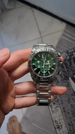 Elegante reloj con esfera de color verde y detalles plateados. - Diseño moderno y sofisticado. - Correa de eslabones metálicos. - Indicador de día y fecha.