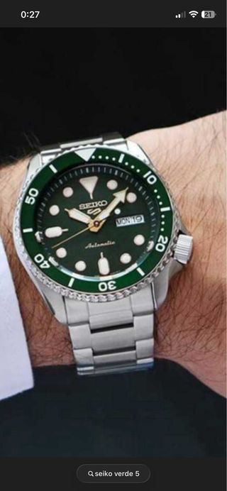 Reloj Seiko 5 Sports con una llamativa esfera verde y detalles plateados. - Bisel giratorio. - Correa de acero inoxidable original. - Ventana de día y fecha. - Papeles y caja original.