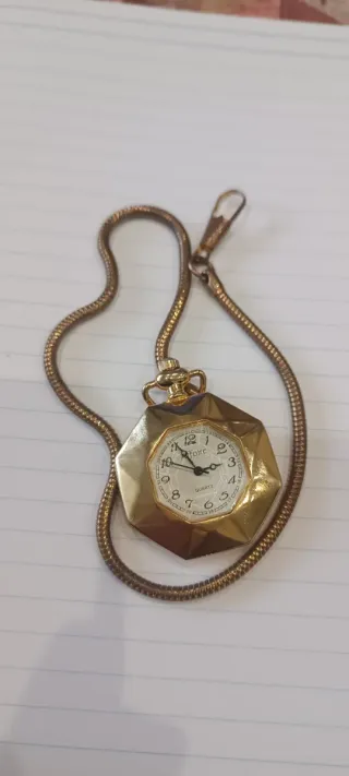 Elegante reloj de bolsillo con cadena. - Diseño octogonal. - Esfera blanca con números. - Mecanismo de cuarzo.