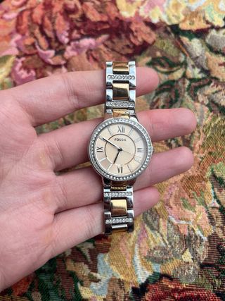Elegante reloj Fossil para mujer con un diseño sofisticado. - Bisel adornado con pequeños diamantes. - Combinación de tonos dorados y plateados en la correa. - Esfera en tono rosa pálido con números romanos. - Falta pila