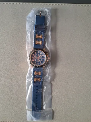 Reloj con correa de silicona azul y detalles dorados. El diseño de la esfera es llamativo y moderno. - Correa de silicona azul. - Bisel y detalles en tono dorado. - Esfera azul con marcadores blancos.