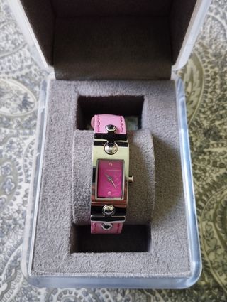 Reloj rosa con esfera en dorado. No lo he utilizado nunca. Actualmente no funciona la pila.