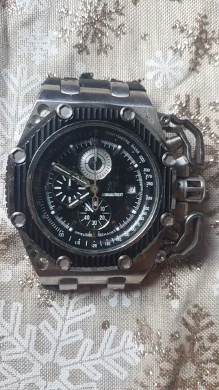 Reloj Audemars Piguet con detalles en negro y plateado. - Esfera negra con cronógrafo. - Bisel con escala taquimétrica. Funciona solo hay que ponerle correa . NO HAY DEVOLUCIÓN YA QUE LO HA DADO TODO