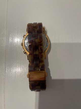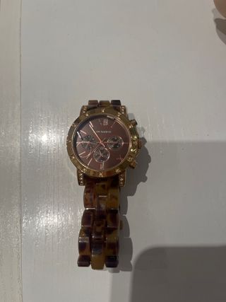 Elegante reloj de pulsera con un diseño llamativo. - Esfera en tono rosado. - Bisel adornado con pequeñas incrustaciones. - Correa con efecto carey en tonos marrones y dorados.