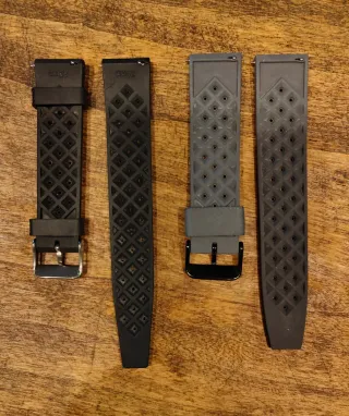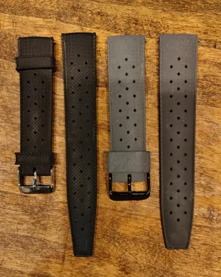 Conjunto de correas de reloj estilo Tropic. La negra de 20mm y la gris de 22mm en perfecto estado. Precio por unidad - Diseño con perforaciones. - Hebillas metálicas.