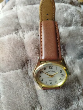 Elegante reloj Louis Valentin con una correa de cuero marrón y detalles dorados en la caja. Un accesorio clásico y versátil. - Esfera blanca con números arábigos. - Mecanismo de cuarzo. - Correa de cuero marrón con pespuntes, sin estrenar
