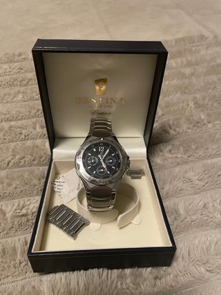 Elegante reloj Festina con detalles en negro y plateado, presentado en su caja original. - Diseño de cronógrafo. - Brazalete de eslabones.