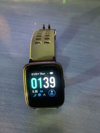 Reloj inteligente con correa de color verde oliva y detalles en negro. - Pantalla a color. - Correa de silicona. - Diseño moderno y ligero.
