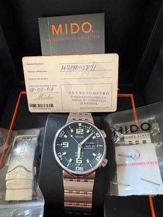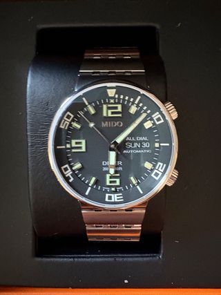 Reloj Mido automático, modelo All Dial, en excelente estado. Revisado recientemente y cambiada correa de caucho por correa acero inoxidable, se adjunta hebilla para caucho, caja y documentación. Trasera vista. - Esfera negra con detalles luminiscentes. - Correa de acero inoxidable. - Resistente al agua 200m. Más relojes en mi perfil.