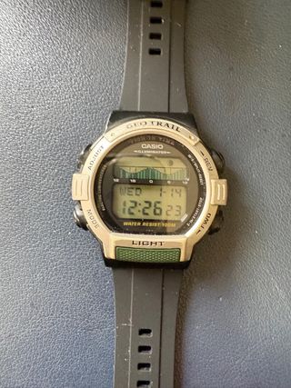 Reloj Casio modelo Geo Trail FT-201 con correa negra. Efectuado cambio pila y de correa. Reloj muy útil para pesca deportiva. - Resistente al agua hasta 100 metros. - Pantalla con iluminación. - Diseño deportivo. ÚLTIMO PRECIO, NO SE ACEPTAN OFERTAS. Más relojes en mi perfil