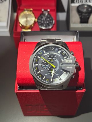 Reloj de pulsera de la marca Diesel con un diseño moderno y elegante. - Esfera con detalles en amarillo. - Correa de metal. - Bisel con detalles.