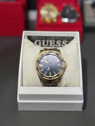 Elegante reloj Guess para hombre con detalles dorados y correa negra. - Diseño con múltiples esferas. - Bisel adornado con pedrería. Precio negociable