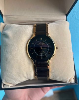 Elegante reloj con correa de acero en tonos negro y dorado.