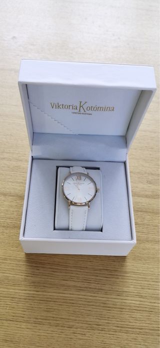 Precioso reloj de pulsera Viktoria Kotomína, de edición limitada. Es de color blanco y dorado, y luce impecable. - Correa de piel blanca. - Esfera blanca con números romanos. - Caja original incluida.