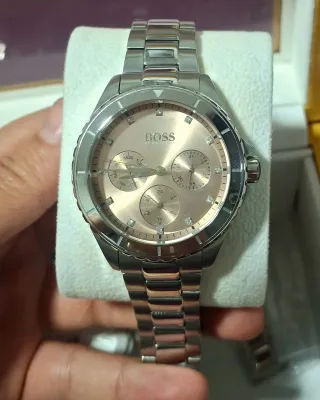 Elegante reloj Hugo Boss de mujer con detalles en plata y esfera champán. - Movimiento multifunción de cuarzo de tres manecillas. - Acero inoxidable - 5 ATM de resistencia al agua. Se puede utilizar en la ducha o para nadar, pero no para bucear en aguas profundas. - Esfera con tres subesferas. Entrega en Ciudad Real. No envío. Precio cerrado. Sin caja.