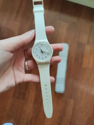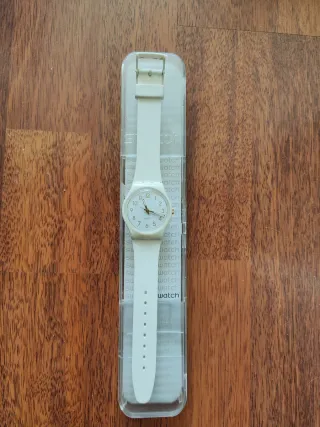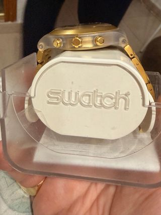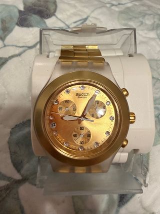 Elegante reloj Swatch con acabado dorado, presentado en su caja original. - Diseño sofisticado. - Incluye la caja original. usado solo 1 vez entrega en mano