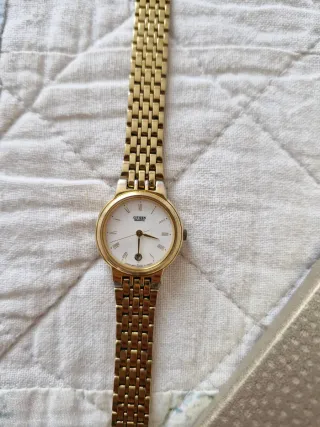 Elegante reloj Citizen para mujer con un acabado dorado brillante. Su diseño clásico lo hace perfecto para cualquier ocasión. - Esfera blanca con detalles dorados. - Correa de eslabones dorados. - Ventana de fecha. - No incluye pila. - Precio no negociable