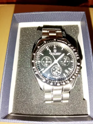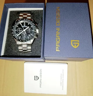 Reloj cronógrafo Pagani Design con esfera negra y detalles plateados. Incluye su caja original y manual de usuario. - Diseño deportivo y elegante. - Correa de acero inoxidable. - Bisel con taquímetro.
