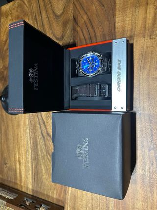 Elegante reloj Festina con esfera azul y detalles plateados. - Caja y brazalete de acero inoxidable. - Diseño deportivo Chrono Bike. - Cronógrafo multifunción. - Correa extra incorporada.