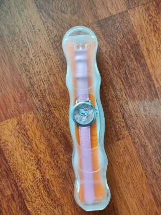 Reloj de pulsera con un diseño encantador de Hello Kitty. La correa es de un suave color rosa y la caja del reloj es plateada. - Esfera con la figura de Hello Kitty. - Correa de piel sintética. - Cierre de hebilla.