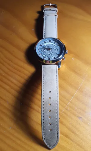 Reloj de pulsera con correa de cuero marrón y detalles dorados. - Esfera blanca con números arábigos. - Ventana de fecha. - Resistente al agua 3 ATM. Hay que cambiar la pila. Con marcas en la correa por el uso, se aprecia en foto. Por eso el bajo precio.