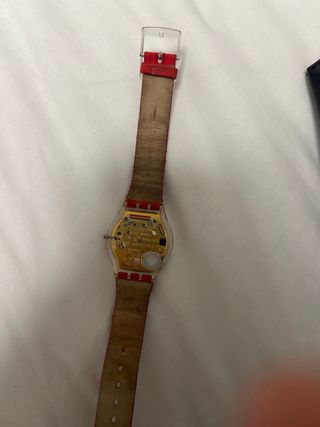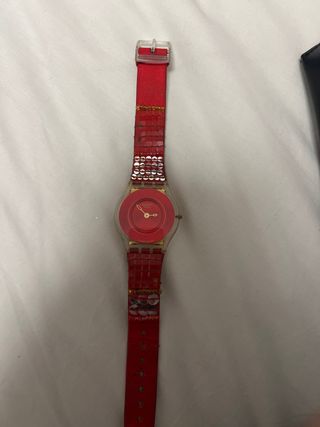 Reloj de pulsera Swatch con un diseño llamativo. - Correa de tela roja. - Detalles en plateado brillante. - Esfera y manecillas en tono rojo.