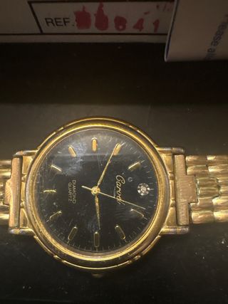 Elegante reloj con un diseño distintivo. - Correa con estampado de la marca, la correa es de piel. -Gira igual que el original. - Esfera con detalles brillantes. - Bisel en tono dorado.