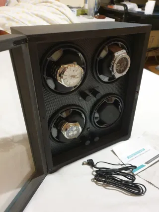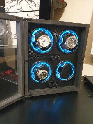 Watch Winder, Elegante caja giratoria para mantener tus relojes automáticos en movimiento tiene funciones de moviendo automaticas, Cuenta con un diseño moderno y luces LED azules, esta nuevo a estrenar apenas se ha usado. - Capacidad para 4 relojes. - Compartimentos individuales con cojines. - Acabado exterior en gris.