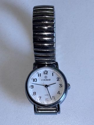 Elegante reloj de pulsera Colmar con una esfera blanca y detalles plateados. Su diseño clásico lo hace perfecto para cualquier ocasión. - Correa metálica plateada. - Esfera redonda blanca con números claros. - Resistente al agua 3 ATM.