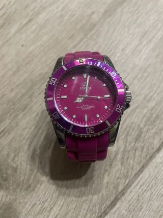 Reloj de pulsera de la marca Marea con un llamativo diseño. - Bisel giratorio con detalles en morado. - Correa de silicona en color rosa. - Esfera en tono fucsia.