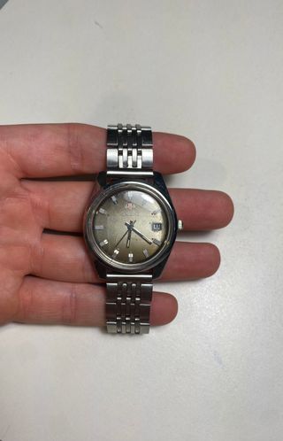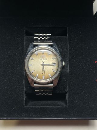 Reloj Orient 21 jewels automático con movimiento 20741 japonés en muy buen estado. Es un reloj vintage de los años 70 con signos de uso pero aún así se conseva en buen estado y funciona perfectamente. Entero en acero inoxidable y con la esfera en color dorado. Caja tamaño 39mm.