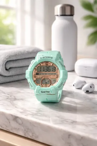 Reloj multifunción con un diseño deportivo y moderno, ideal para el día a día. - Correa de silicona en color verde agua. - Esfera con detalles en tono dorado. - Resistente al agua hasta 5 ATM.