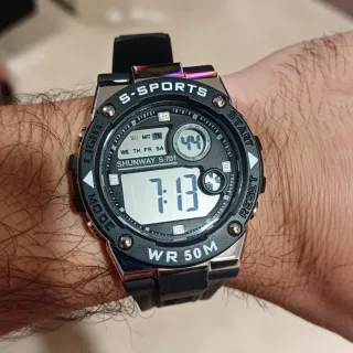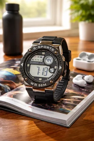 Reloj deportivo con un diseño moderno y funcional. - Correa de caucho negra. - Bisel con detalles plateados. - Pantalla digital. - Resistencia al agua WR 50M.