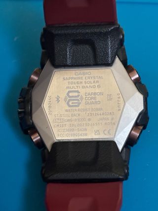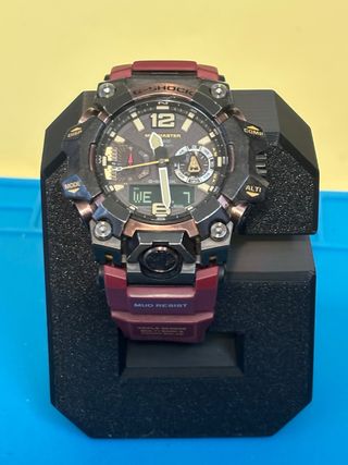 Reloj G-Shock Mudmaster con un diseño robusto y llamativo. - Bisel y detalles en color rojo. - Correa de resina resistente. - Esfera con múltiples indicadores. - Cristal de zafiro. - Tough Solar. - Multiband 6 - Bluetooth. - Doble iluminación. - Resistente a vibraciones. - Termómetro. - Altímetro, suma y memoria del alturas. - Barómetro. - Brújula. (Solo reloj)