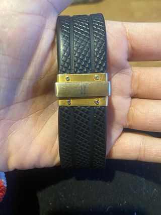 Elegante reloj Hublot con detalles en oro y esfera azul. - Diseño sofisticado. - Correa negra. - Bisel negro.
