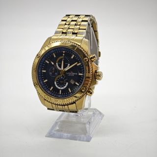 Reloj de pulsera con diseño deportivo y elegante. - Esfera negra con detalles dorados. - Correa metálica combinada en dorado y plateado. - Bisel giratorio con marcadores de tiempo.