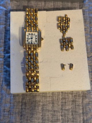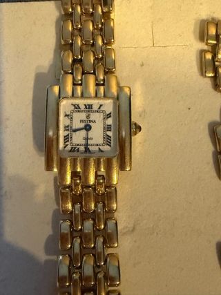 Elegante reloj Festina para mujer. - Diseño clásico en oro de 18 quilates. - Esfera con números romanos. - Con un peso total de 48,60 gramos. - Valoro el cambio por cadena de oro de hombre de 18k valorando diferencia si el peso es superior. - La pulsera esta modificada para muñeca pequeña,pero se incluye las piezas del mismo para agrandarlo el peso total son con los eslabones incluido.