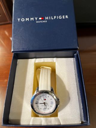Reloj Tommy Hilfiger en color blanco, con detalles plateados. Se encuentra en buen estado y se entrega en su caja original. - Correa de silicona blanca. - Esfera blanca con números y detalles en color plata. - Cierre de hebilla. Pila nueva.