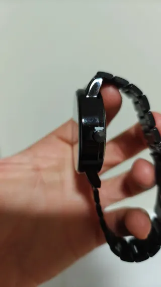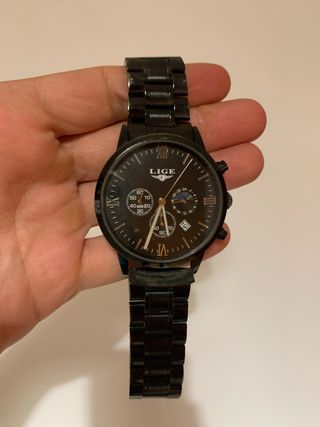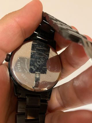 Reloj de pulsera con un diseño elegante y moderno. - Esfera negra con detalles dorados. - Correa de metal. - Resistente al agua. Tiene un pieza despegada pero se puede pegar sin problema (última foto)