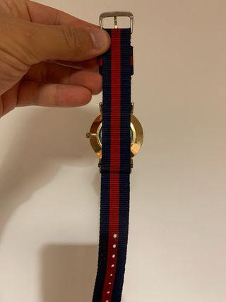 Elegante reloj con correa de tela a rayas. - Esfera blanca. - Correa con diseño de rayas azules y rojas. - Hebilla metálica.