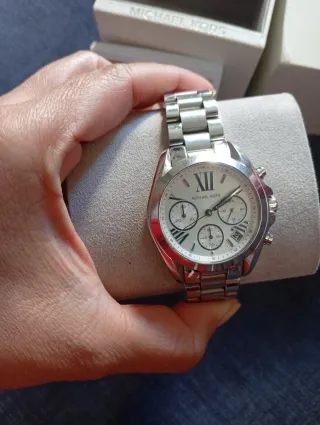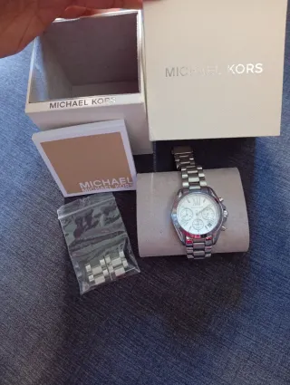 Elegante reloj Michael Kors con detalles plateados y esfera blanca. Incluye eslabones adicionales para ajustar la correa. (Pila funcionando 🥰) ♥️-READY TO USE-♥️ - Diseño sofisticado. - Correa de metal. - Caja original incluida.