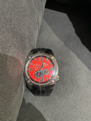 Reloj de pulsera con un diseño moderno y llamativo. - Esfera de color rojo vibrante. - Correa de goma negra. - Detalles plateados en la caja.