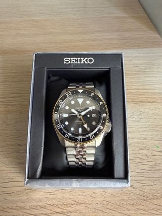 Reloj Seiko 5 Sports con función GMT y movimiento automático. Presenta una combinación de colores negro y dorado. El modelo es el ssk021 - Bisel giratorio bidireccional. - Indicadores luminosos en la esfera. - Correa de acero inoxidable. El cristal fue cambiado porque no me gusta el ciclope, por lo que le puse uno plano que para mi gusto queda mejor. Incluye caja original